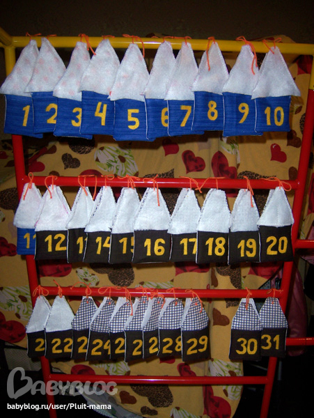 То что шилось в ночи, делала для адвент календаря - вот он такой у меня вышел в полной комплектации домиков. :) Но на послдение домики, как видно, не хватило белого фетра. Дошью потом.