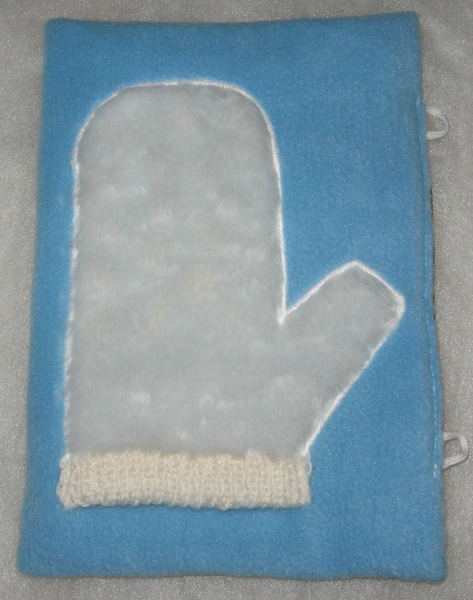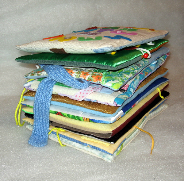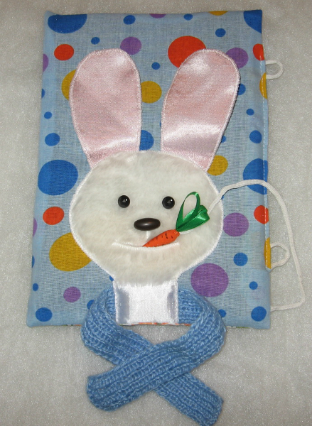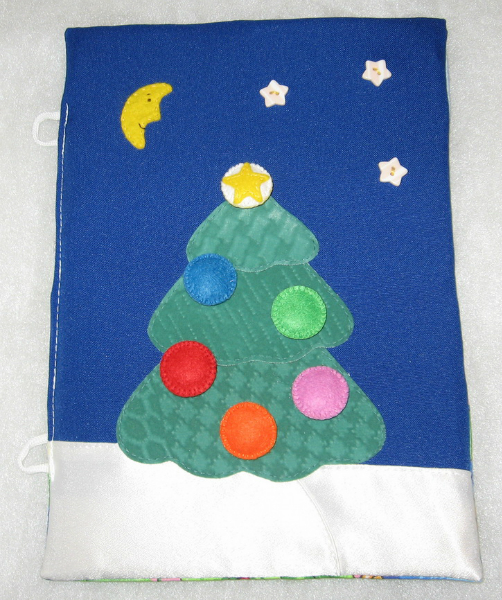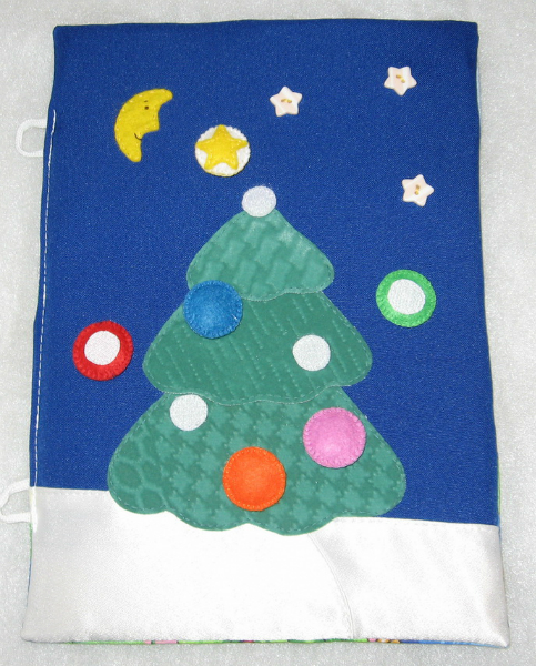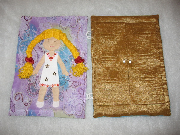 Внешний вид. Сделала без застежки, потому как книга будет разделяться между детишками и зачастую страницы будут перемещаться хаотично. Также не вшивала в первую страницу (как я делаю обычно) ленты. Вместо лент во всех листах петельки. Четыре ленточки прилагаются отдельно.