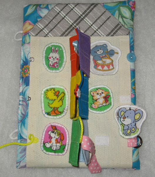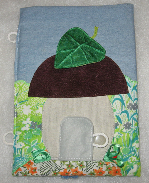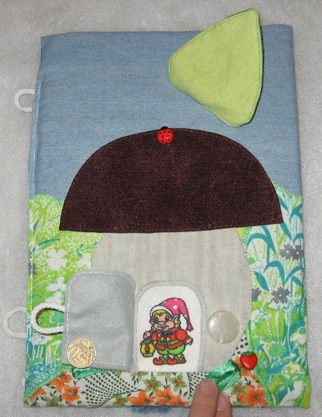Под листочком прячется божья коровка, за дверью - гномик, в травке - ягодка. Листочик шуршит. Дверка запирается при помощи застежки петля-пуговка.