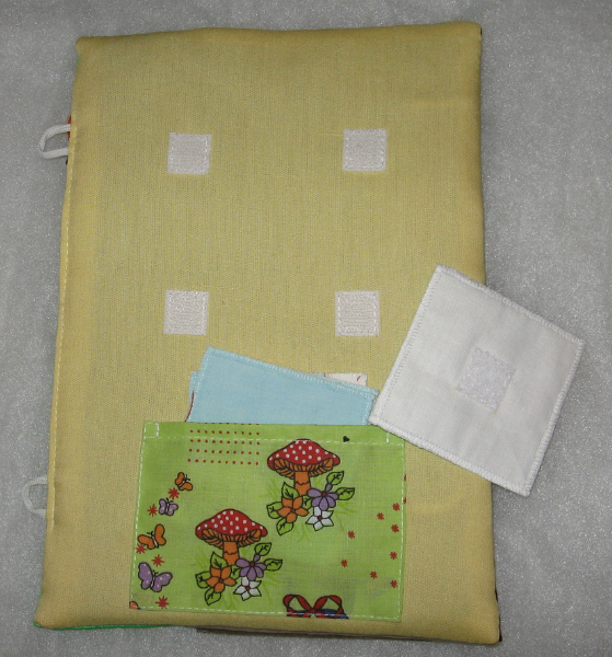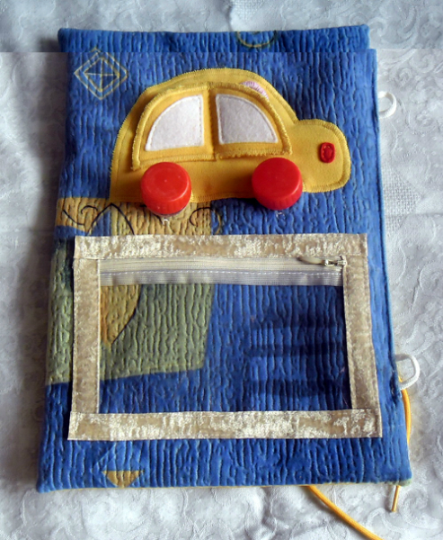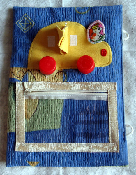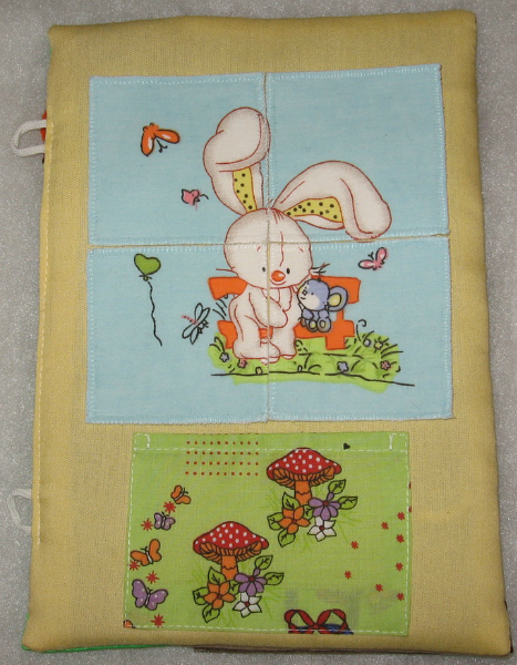 Пазл. Взят готовый принт с детской ткани, разрезан на 4 части. Внизу кармашек для частей пазла. Сам пазл собирается на липучку.