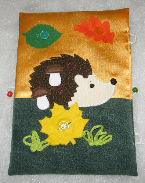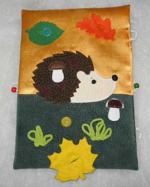 Осенняя страничка. Съемные элементы - листочки и грибочки, Можно просто закреплять счет до трех, можно разнообразить - один ежик, два грибочка, три листочка. Развитие мелкой моторики - надеваем листочки на пуговки соответствующих цветов