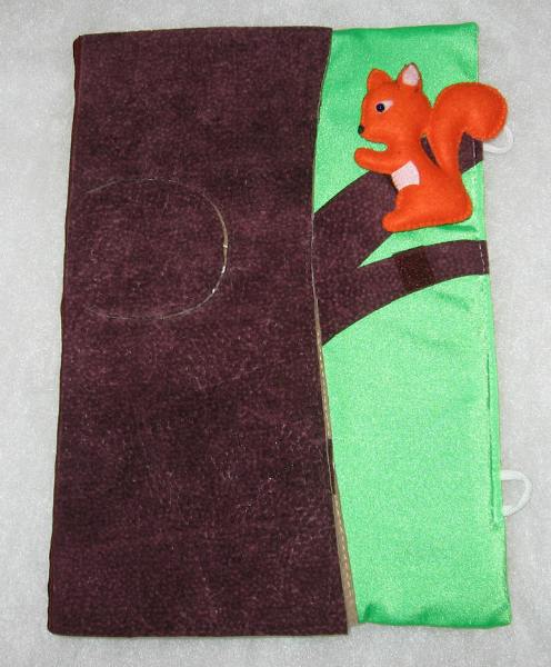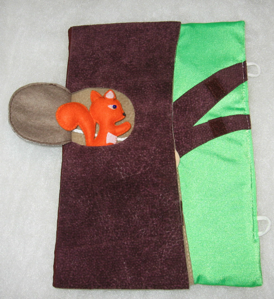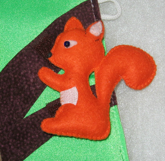 Дерево с дуплом, запасами и белочкой. Белочка может быть использована как самостоятельная игрушка. Животик у нее сделан из жесткой части липучки. Так же изучение понятий верхний/нижний.