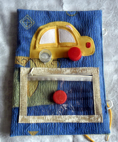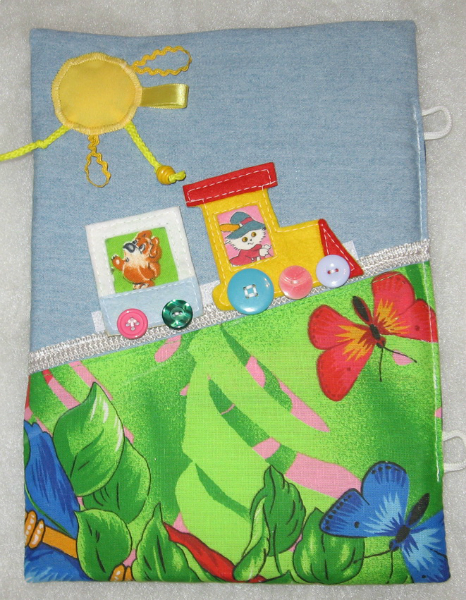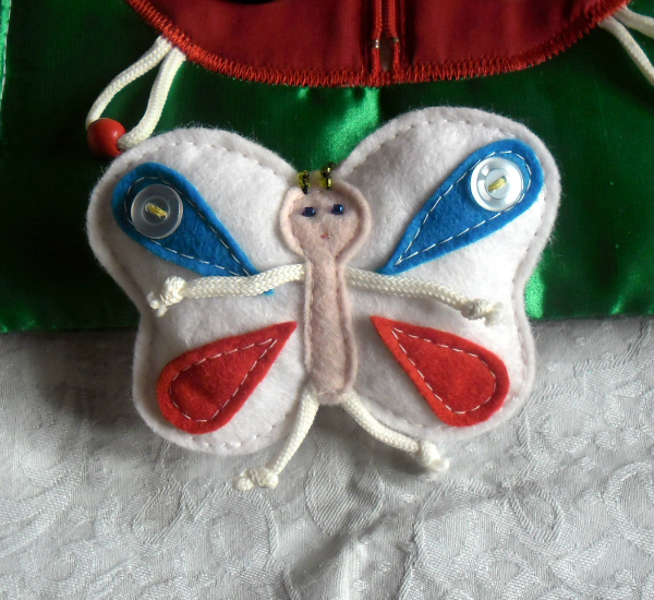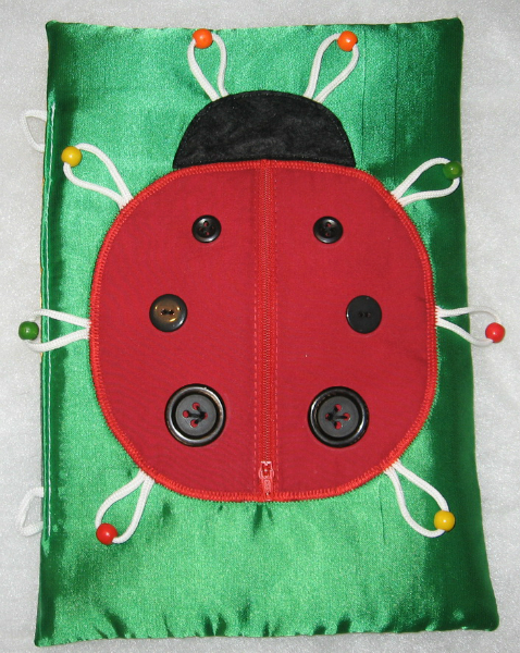 3 стр. - божья коровка. На лапках бусины - найди одинакового цвета. Точки-пуговки. В божьей коровке прячется маленькая бабочка. Может выступать как самостоятельная игрушка.