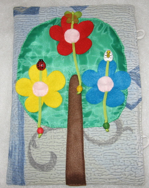 2 стр. - дерево с цветочками, изучение основных цветов. Фигурки-перетяжки - божья коровка, бабочка, пчелка - прячутся в серединки карманы.