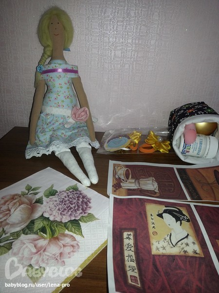 Очень рада то понравилось всё)) Куколке решила нарисовать личико, потому что Лизочка махонькая ещё, и я подумала вдруг испугается безротой куклы..) Пусть играется на здоровье! ))) У меня декупажных салфеток то не было..еле нашла карты и 1 салфетку..))) Жду теперь от тебя декупажных творений!! )))