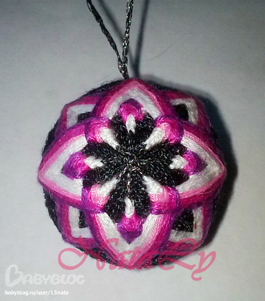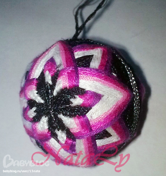 Спасибо, Катюш)))) Скачала книгу, но там все очень кратко описано. Смотрела картинки в интернете и рисунок сама изобрела. В процессе понимала, что и как. Основу сделала из кусочка старой футболки)))) Он на самом деле корявенький получился, зато я поняла, что разметка ровная очень много значит. Сегодня купила шарики, они диаметорм примерно 6 см, буду на них дальше учится. А этот совсем малыш, наверное 3 см всего.