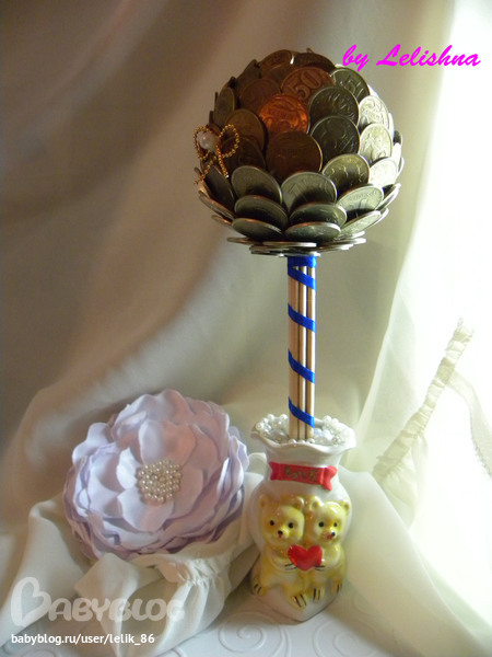 это моя работа, можете еще глянуть в группе http://vk.com/club26335212 там есть альбом с топиариями, несколько вариантов денежного дерева. крепятся монеты на горячий клей, причем если уж и приспичит одаряемым его разобрать, то монеты не страдают, их можно оторвать от основы ( шарика) и клей так же можно оторвать от монеты!