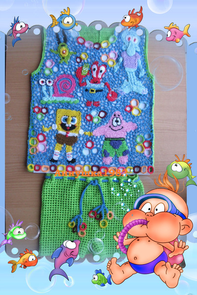 Любит моя Аленка Спанч Боба, ну вот что с этим поделать?! Даже вязать не давала - растаскивала вязанных жителей Бикини Ботом, подходила к выкройке сама ковыряла крючком, такая смешная. Теперь осталось связать беретик в этой же тематике.
