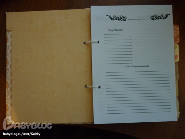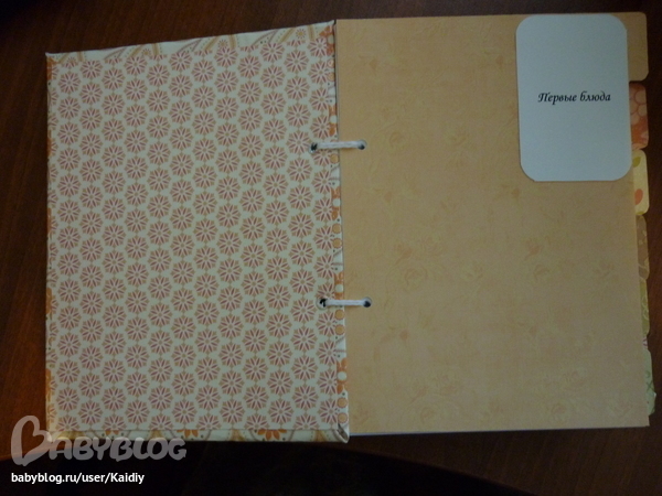 СкрапбукингДевочки, вот впервые делала кулинарный блокнот именно с разделителями. Делался он на заказ, старалась все пожелания заказчицы выполнить, разлиновку страничек, разделители и все такое. Просили без украшений, всего по-минимуму. Скосячила немного с последним разделителем, но вроде не сильно заметно. Мне вот не нравится как надписи на разделителях у меня, подскажите как можно в следующий раз получше сделать? А то как то белым пятном на глазу прям...