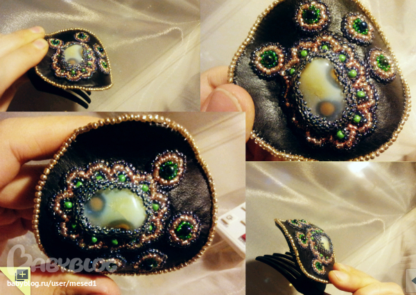 Зажим сделан из натурального морского агата, чешского бисера и натуральной кожи. Дл/шир- 7,5/7,5 см. Кожа закреплена на фурнитуре (зажим) производства италии.