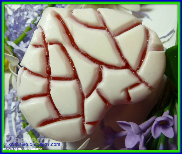 Спасибо Наталь! я влюбилась в твои шарики и сделала себе такие же, и вставила их в мыло 8 марта. Идея про шарики мне ну оочень нравится! А лава любви это обычная форма сердца, я сделала из красителей красное мыло, облила его белой основой и выцарапала на ней трещины. Давно у меня была такая идея и я ее наконец сделала)))