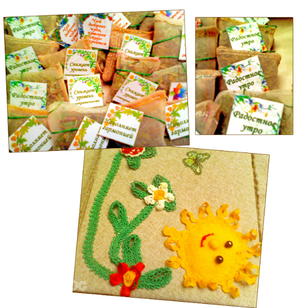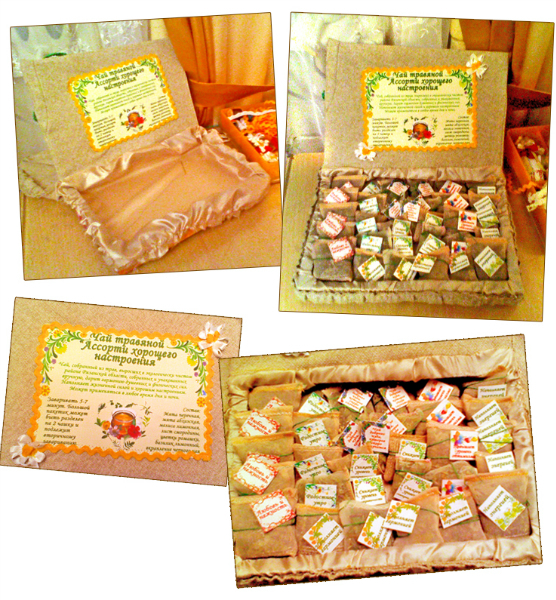 Люблю очень чаи травяные собирать-составлять, а недавно пришла мне в голову идея свой сбор зашить в пакетики, приклеить ярлычки и красиво оформить. Пакетики шила из органзы, ярлычки-этикетку нарисовала-напечатала на принтере, коробочку обшила тканью и украсила цветами-листиками из тесемочек и вышитым солнышком. Получилось очень уютно. А запах! Просто волшебный! Жаль, что фотки с телефона, и аромат не передашь, но все же, вот как оно выглядит: