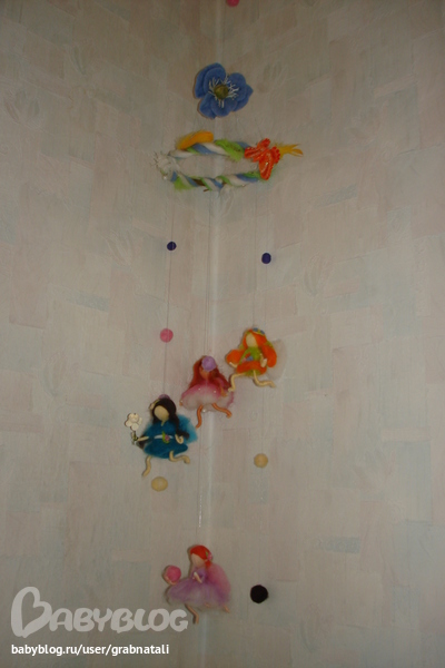 Фелтинг (валяние шерсти)Вот так украсила скучный угол над своим рабочим местом. Теперь эти красотки кружаться надо мной и вдохновляют меня.