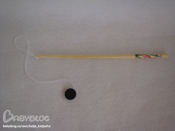 Вот такая удочка. Основа - палочка для суши, а верёвочку приклеила к магниту и прикрыла кусочком фетра, чтобы было аккуратненько))