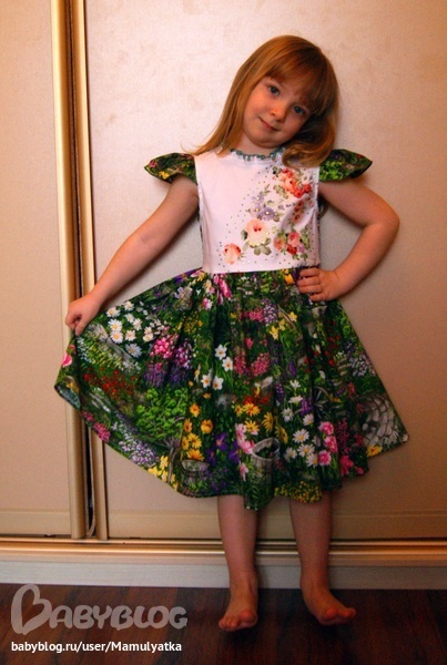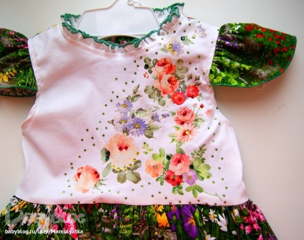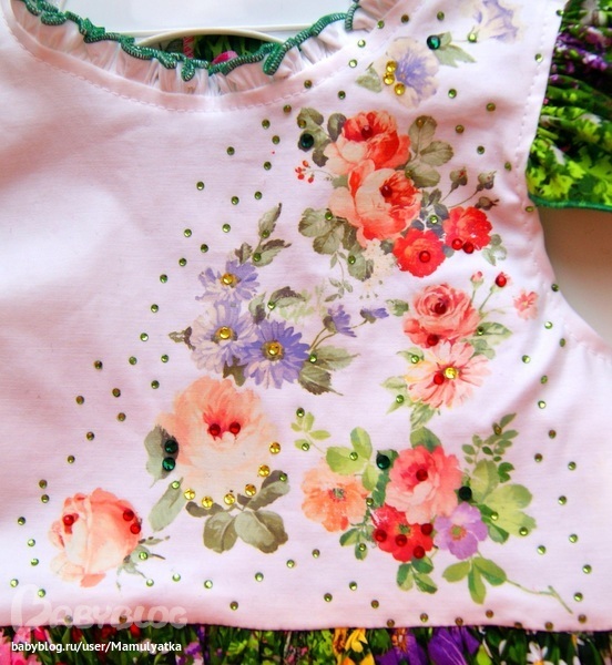 Ткань в цветочек - хлопок для пэчворка, белая - плотный хлопковый сатин, аппликация: термотрансферы, задумка была: застежку сделать на планке спереди, но обе полочки загубила, когда клеила термотрансферы, на одной не приклеились цветы частями, на другой сожгла ткань)) короче, помучилась с этими цветами, поэтому сзади на лифе не белая ткань, а тоже в цветочек, стразы ДМС, горловину подсмотрела в магазине детской одежды