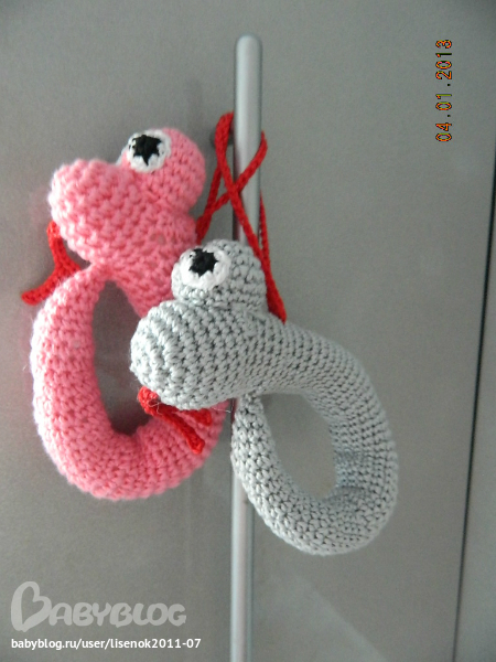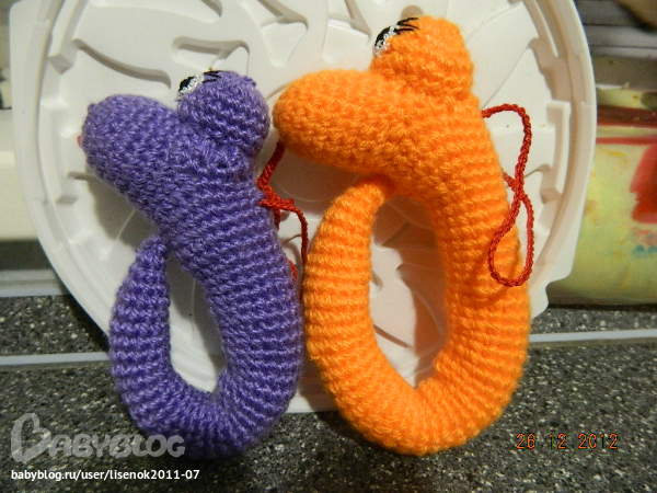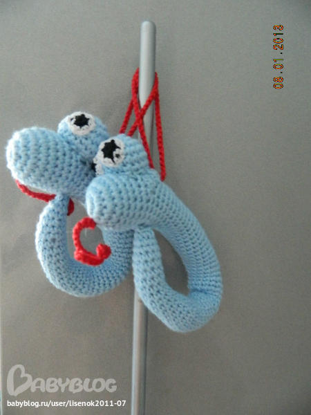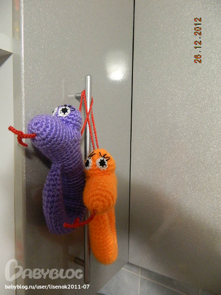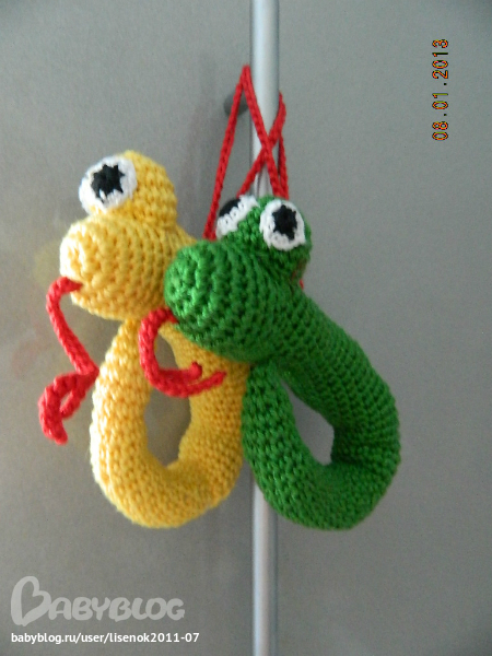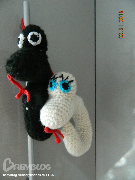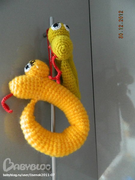 Ох, и замучалась я с ними))) Вроде однотипные (но чтоб самой не скучно было, я разными цветами вязала), но вязать долгонько (для меня)))). А ведь всем друзьям вместо открытки хочется преподнести, а еще есть коллеги по работе, хорошая тетя в развлекательном центре, куда мы ходим, дворник, которая разрешает нам коляску в ее подсобке оставлять ит.д.и т.п. В общем, даже до НГ не успела всех связать)))) Так что довязывала и в праздники, да и сейчас нет-нет да парочку свяжу (на всякий случай! И ведь пригождаются!) Так что если не лень, прошу под кат, там змей МНОГО)))