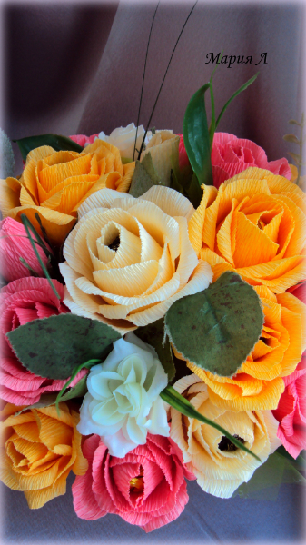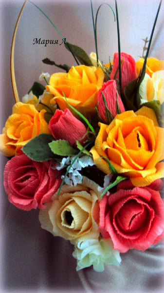 Мария! Очень красивые, нежные розочки, сочный букет! А если добавить еще немного зелени, будет пышнее и натуральнее выглядеть! Ну это ИМХО. Просто люблю, когда зеленушки много)))