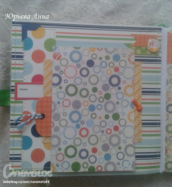 Альбом размером 20*20, 7 разворотов, 14 страниц. Альбом вмещает 41 фотографию размера 10*15. Поскольку я раз и на всегда влюбилась в ручную строчку в альбоме, а с машинкой все никак не налажу контакт, все швы сделаны вручную, включаю обложку. Есть место под записи родителей, какому событию посвящена данная страница альбома, тег с местом для записей о первых самостоятельных достижениях ребенка. Страница о крестинах содержит информацию где крестили ребенка, кто совершил обряд, а также место под короткие данные о крестных родителях и их пожелания крестнику. В конце альбома есть место под диск с дополнительными фотографиями.