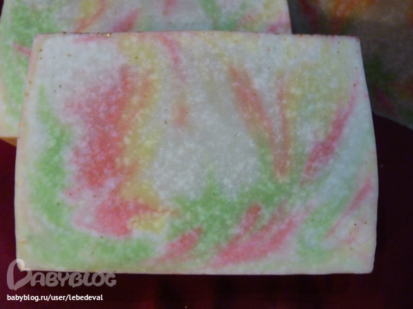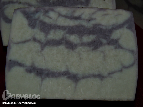 Крупинки белые на фото - это мыло прошло гелевую стадию, но оно еще сырое. После 4-8 недель мылко будет беленькое, равномерно окрашенное, без крупинок.
