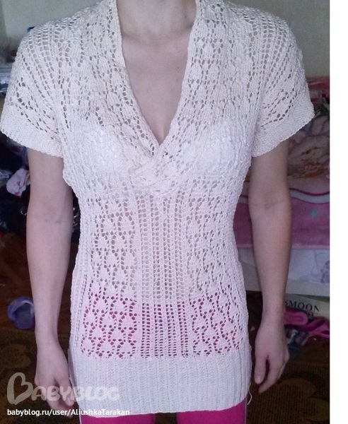 Да, согласна с девочками, что по пропорциям вам не очень подходит, может резинку убрать? А попробуйте ее одеть на тоненькую водолазку, а низ кофточки чуть присборить, будет как жилетка ажурная). А так, получилась красивая)))