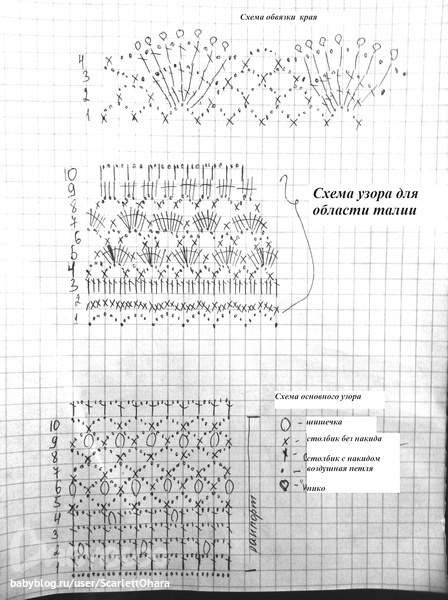400 - нормально, ажурно получится) у меня толще нитки, грубовато получается... начала по нижней схеме - основной узор, раппорт в высоту, кол-во раппортов зависит от р-ра изделия. Петли не считала, чесс слово)) вязала цепочку длиной равной ширине платья. Вяжу пока по кругу, дойду до спинки с передом надо разделить, т.к. глубина горловины у них разная, просто по кругу получится одинаково спереди и сзади, а это не правильно))