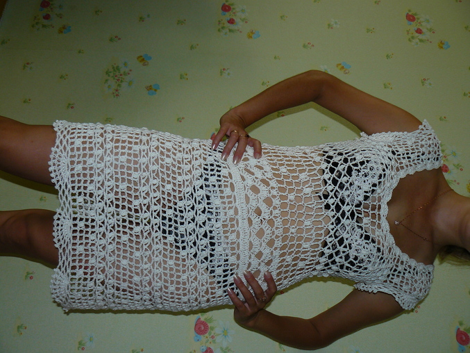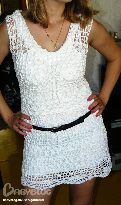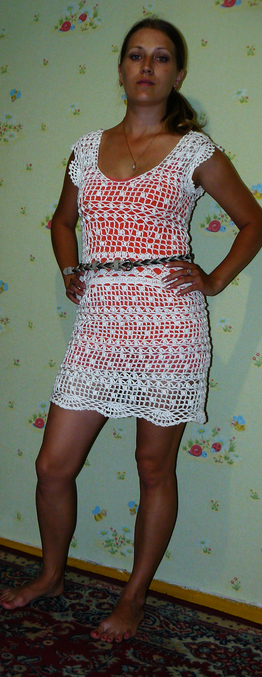 Я тоже из совсем начинающих-это моё первое платье,только всё обвязку не сделаю..дочь ни как не даёт)))Сначала связала образец,постирала его,убедилась,что нитки подходящие,хлопок у меня.Вязала снизу вверх по кругу,набрала на себя 140 петель по моему,связав немного вверх,может один рапорт,перевернула вязание,привязала нитку к низу платья и связала обвязку,затеп продолжила вязать вверх,убавок,прибавок я не делала.В верху,разделила вязание на перёд и зад,когда вязала делала пару прибавок и на спине и на груди,прибавки легко делать на квадратиках,просто в одну и ту же петлю провязывала два квадратика,а не один.В области проймы тоже разделила,сначала одну половинку немного не довязывая в середине,чтоб сформировать вырез,потом вторую половинку,затем довязала спинку,тоже делала прибавки,т.к узковато получилось.Сшила плечевые швы я их верней скрепила друг с друго столбиками без накида))ну и пока всю,обвязку делать надо.
