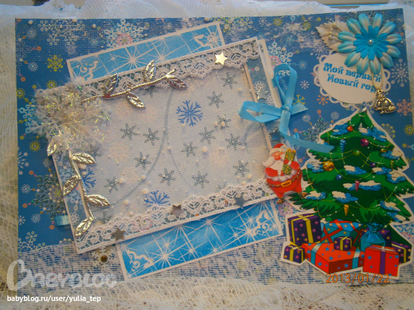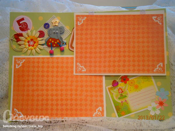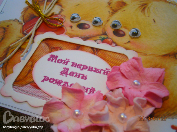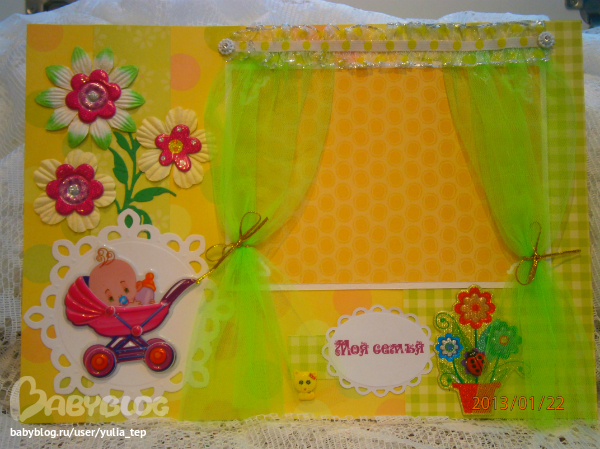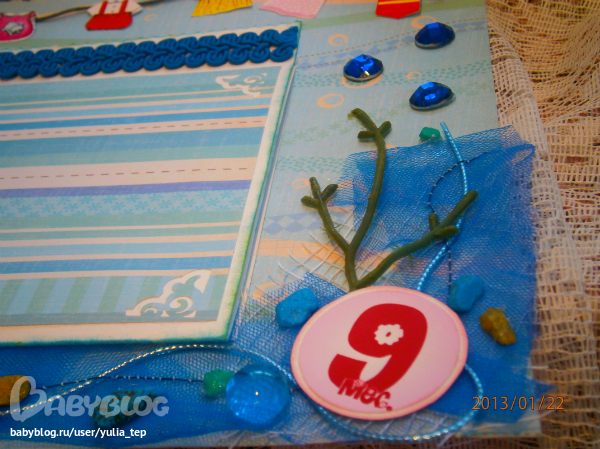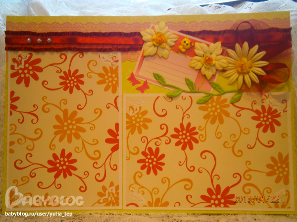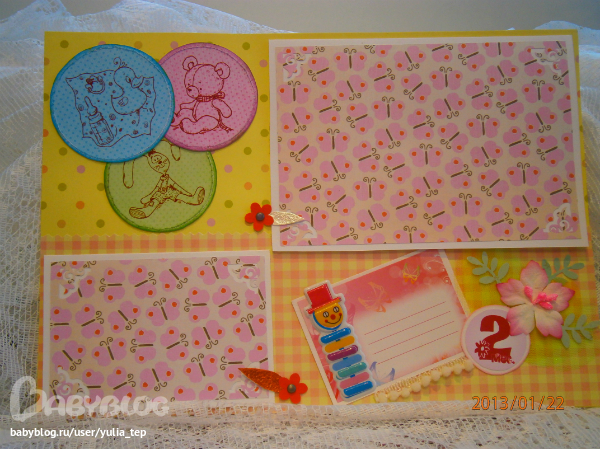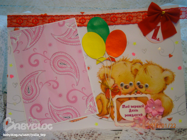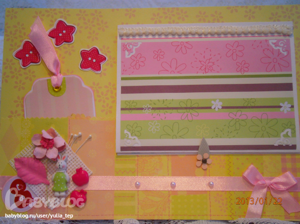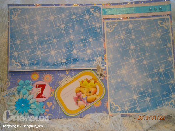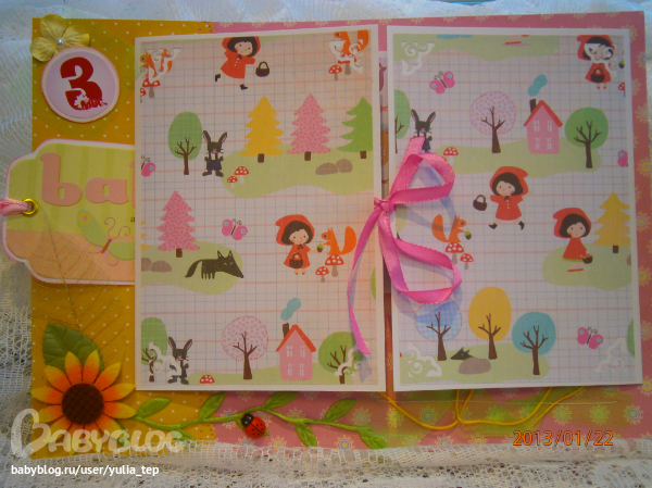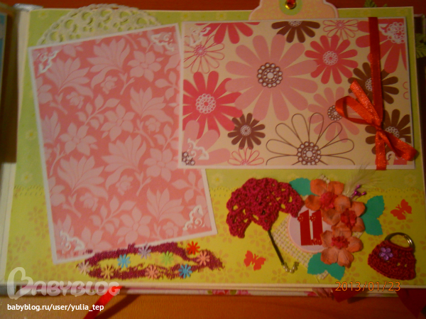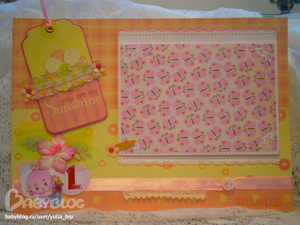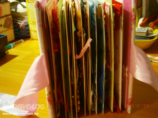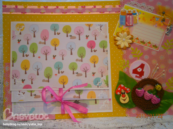 Сами страницы делала 10 дней. С маленьки ребенком это было ооочень тяжело..... И сразу у меня вопрос к девочкам, которые делают альбомы на заказ: они у вас окупаются? Я в полном расстройстве, т. к. у меня совсем не окупился, т.е. примерно окупился, но я без какой-либо прибыли((((((( Почему так? Его себестоимость я насчитала аж на 1700!!!!!!!! Хотя в нем ничего особенного и дорогого нет. Формат А4. 10 листов, т.е. 20 страниц+два форзаца. Вмещает 67 фото 10х15 и 5 фото нестандартного размера. Обложка мягкая, на синтепоне, завязывается на ленты. С заказчицей сразу договорились о цене, поэтому сейчас завышать я не могу. Но мне так хотелось и дальше этим заниматься, но при таком раскладе вряд ли получится... Подружка хотела заказать на подарок, а когда я ей сказала сумму, тоже была в шоке.... Вобщем незнаю я, почему так вышло....