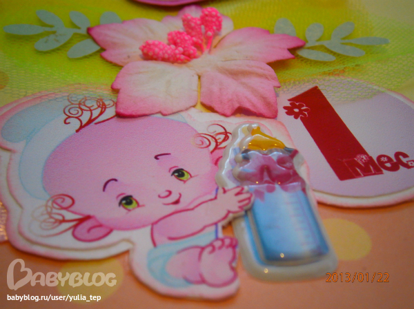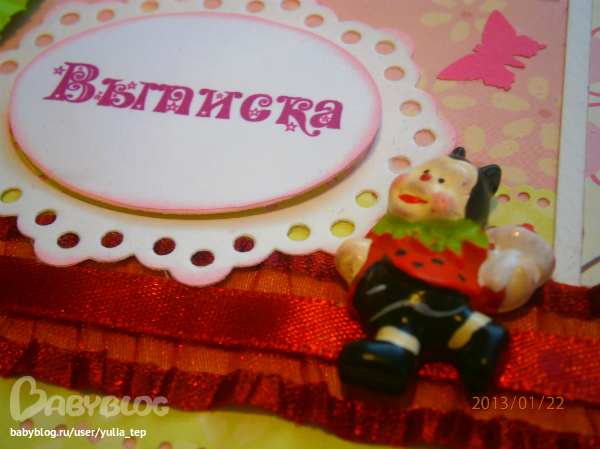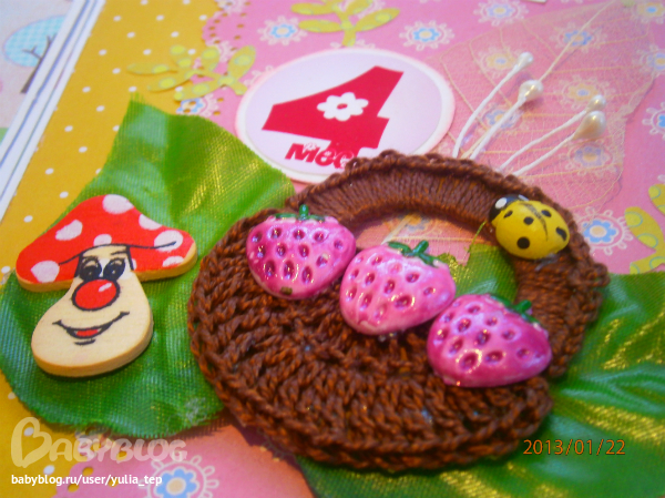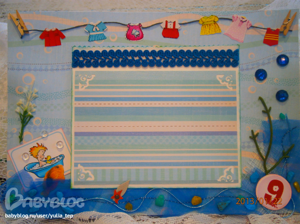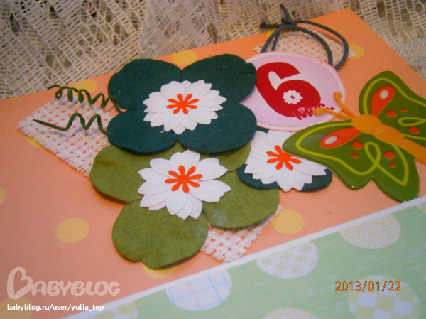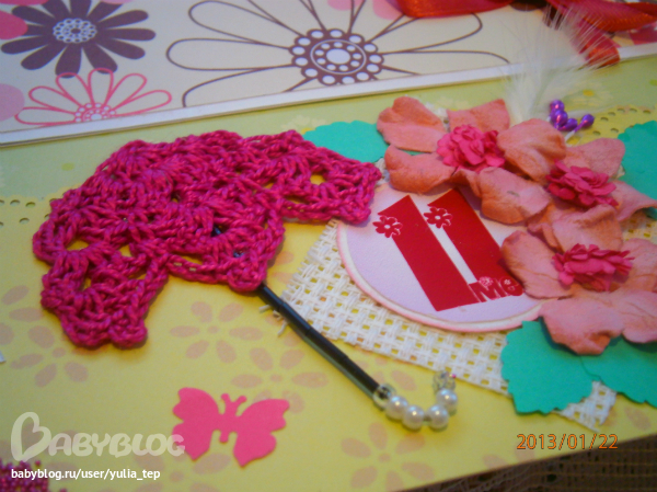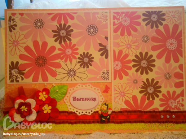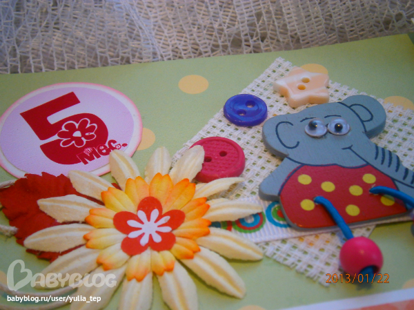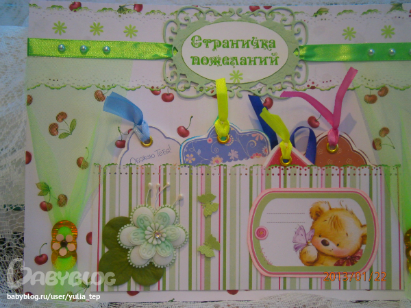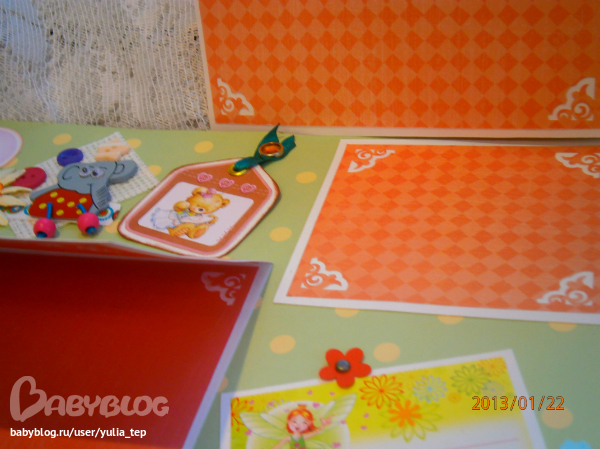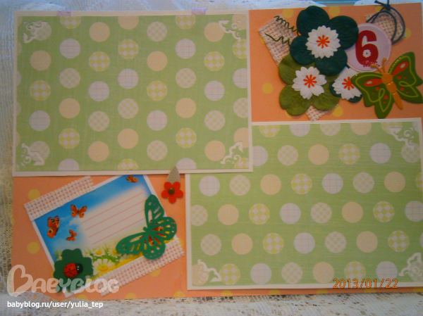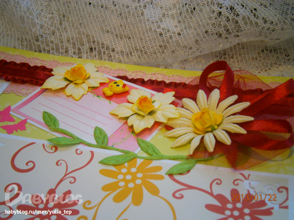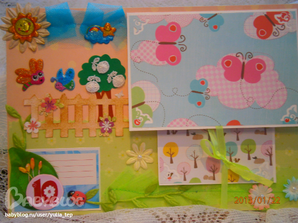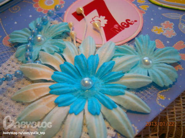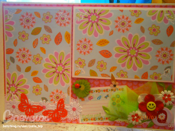 Сами страницы делала 10 дней. С маленьки ребенком это было ооочень тяжело..... И сразу у меня вопрос к девочкам, которые делают альбомы на заказ: они у вас окупаются? Я в полном расстройстве, т. к. у меня совсем не окупился, т.е. примерно окупился, но я без какой-либо прибыли((((((( Почему так? Его себестоимость я насчитала аж на 1700!!!!!!!! Хотя в нем ничего особенного и дорогого нет. Формат А4. 10 листов, т.е. 20 страниц+два форзаца. Вмещает 67 фото 10х15 и 5 фото нестандартного размера. Обложка мягкая, на синтепоне, завязывается на ленты. С заказчицей сразу договорились о цене, поэтому сейчас завышать я не могу. Но мне так хотелось и дальше этим заниматься, но при таком раскладе вряд ли получится... Подружка хотела заказать на подарок, а когда я ей сказала сумму, тоже была в шоке.... Вобщем незнаю я, почему так вышло....