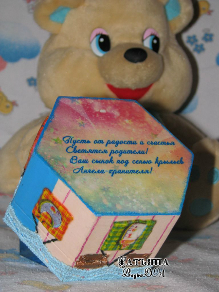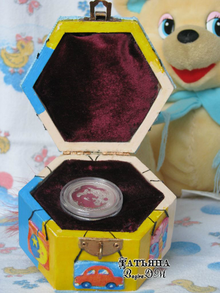 Это первая - шкатулка-коробочка под монетку. Была подарена на крещение ребеночку, поэтому надпись на дне коробочки соответствующая: