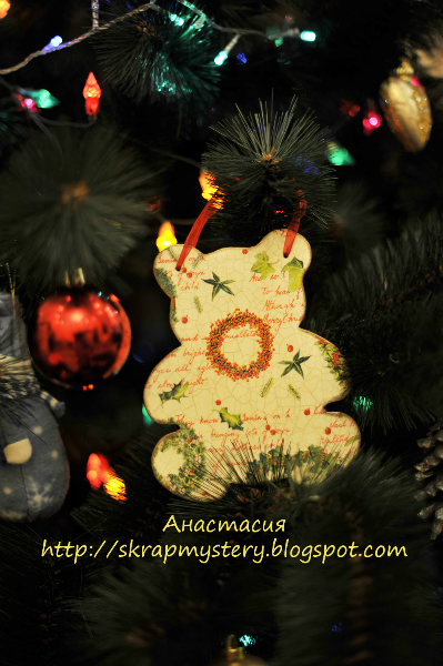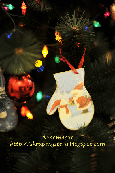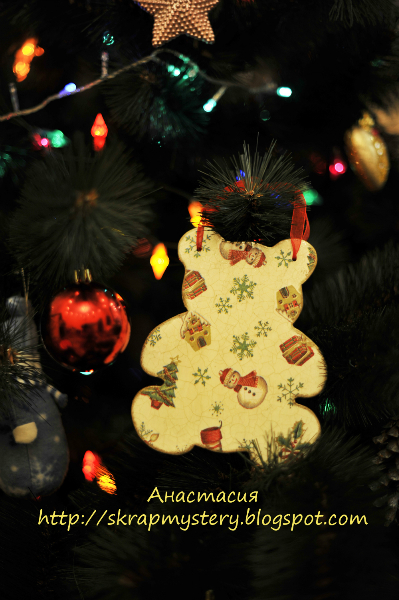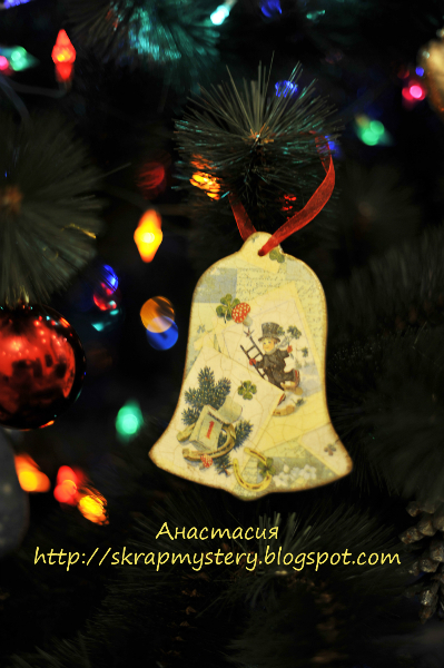 Это деревянные игрушки, салфетка и двухшаговый кракелюр. Колокольчик остался дома. Он прям такой старенький получился :) Все игрушки двухсторонние.