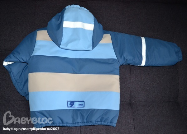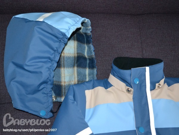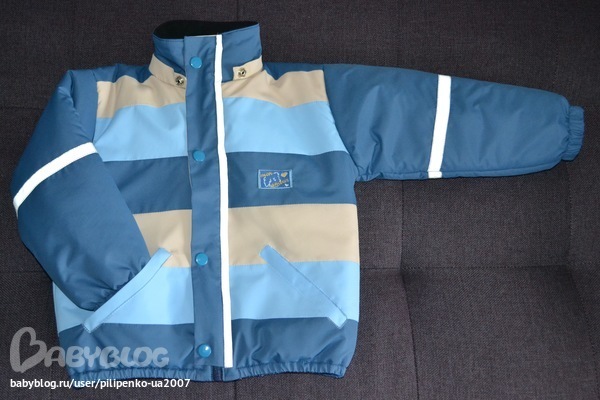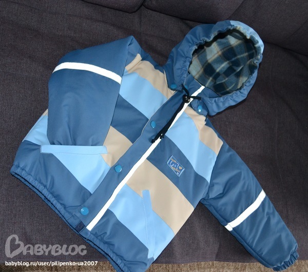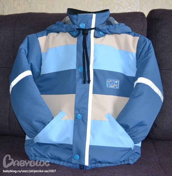 Ушло 60 см синей, 50 см голубой и 15 см молочной плащевки, до 1 метра подкладочной ткани самой обычной, кусочек флиса в капюшон и на воротник-стойку, 8 кнопок, резинка в манжеты и низ курточки, молния 50 см, светоотражающая лента, около 1.5 м, синтепон, тоже до метра, не скажу точно.