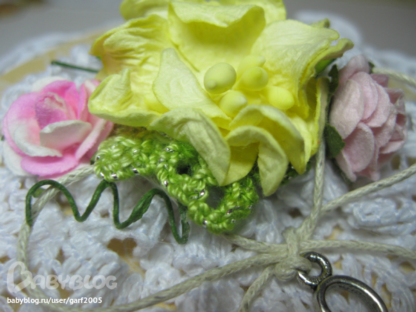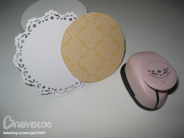 Соединила клеем кружево-держатель с основой крышки.Потом один кружок из бумаги приклеила с картону, а под второй подложила сделанное с помощью дырокола бумажное кружево. Это делать не обязательно, тут уже как подскажет Ваша фантазия.