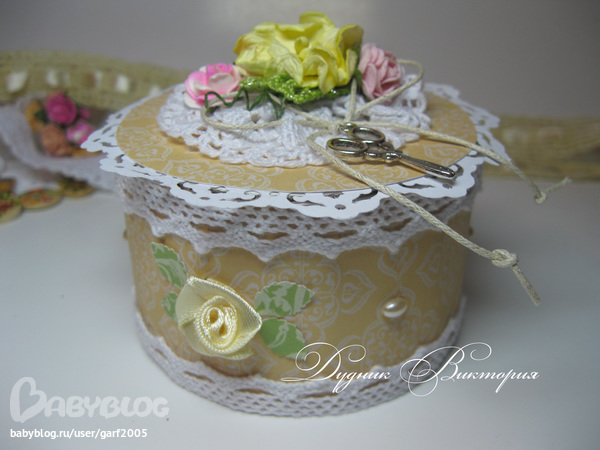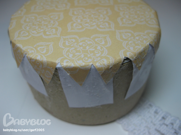 Перед приклеиванием бумаги подклеила полоску кружева для соединения шкатулки с будущей крышкой.