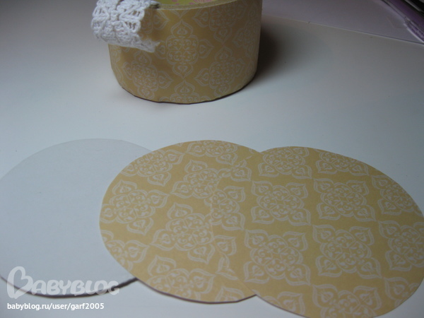 Такого же диаметра вырезаем 3 круга из скрап бумаги. Два для внутренней и наружной части крышки и один для донышка. Второй для донышка будет другого цвета. Об этом дальше.
