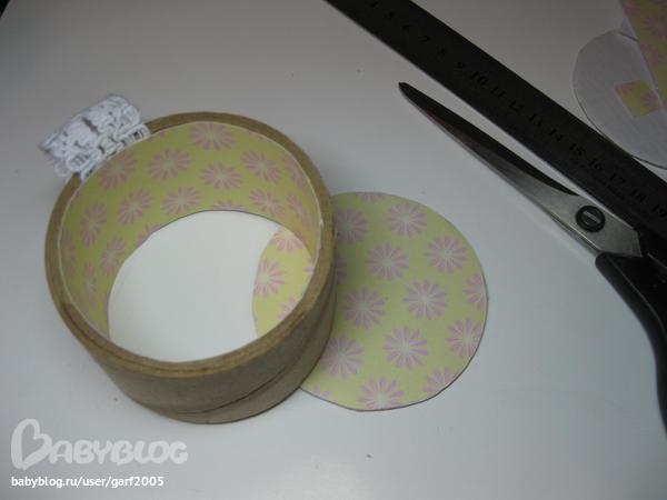 Делаем шкатулке дно. С одной стороны на картон я наклеила кружок из бумаги, а обратной полоски бумаги. Таким образом соединяем бобинку с донышком.