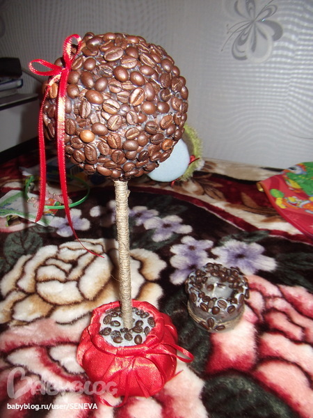 Участвовала в новогоднем ОП и одним из пожеланий моей одаривамой был кофейный топиарчик для их бабули. Очень хотелось порадовать, но так так делала в первый раз получилось далеко не идеально. Самое большое моё переживание - то, что видно излишек клея (вернее я им всё залила ))))))). Девушки-умельцы, если Вам не сложно, подскажите, как мне в следующий раз не допустить такой ошибки? Очень буду признательна за советы ))))