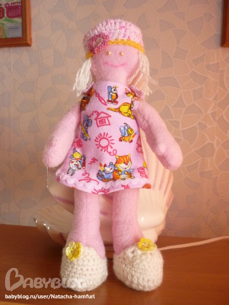 Сыну нравится - это уже здорово!!! Мой Темыч всегда игрушки оценивает! А раз она у вас розовая, просто нужно было платье и беретик сделать другого цвета, а то уж больно много розового, да для мальчика... И глазки заменить на черненькие пуговки! И все отлично!!! Удачи в дальнейших пошивах!!!!