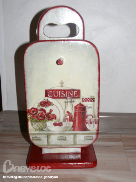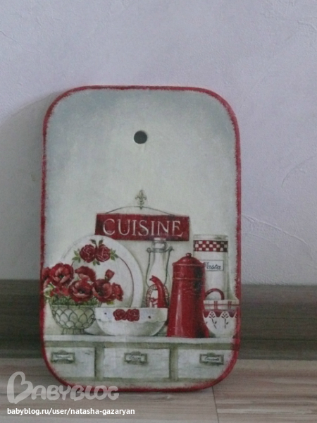 Наташа, не перестаю завидовать твоему грамотному подходу! Да конечно на лаке резать нельзя, впринципе новые доски можно декорировать: одну сторону декупажить , а вторую оставлять как есть. А если доска с двух сторон задеупажена, то при хорошем лаке можно испльзовать под не очень горячее :-)... всмысле сковордки с плиты не выдержит, а вот чашки например, нормально...