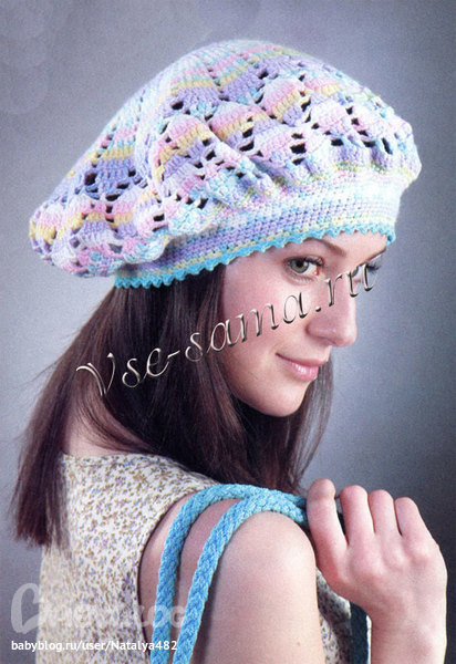 Наберите цепочку из 10 возд. п., замкните в кольцо. В центр кольца ввяжите 21 ст. с/н. Далее вяжите по схеме. После этого вяжите ст. б/н., выполняя равномерно убавления в каждом ряду (5 п., 7 п., 10 п.) до необходимого размера обхвата головы. Затем провяжите 3-5 рядов без убавлений. Края берета обвяжите бирюзовой нитью столбиками б/н. с «пико».