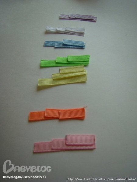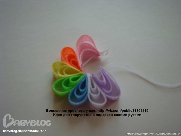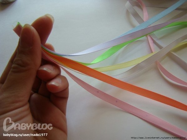 1. лента 7 разных цветов-розовый, оранжевый, желтый, салатовый, голубо, белый, бледно-фиолетовый каждого цвета около 20 см уходит