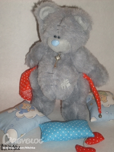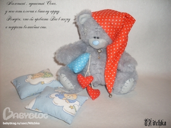 вот и до меха руки добрались:) рост стоя 18 см, подвижное нитяное крепление лап, искуственный мех, ткань под замшу, хлопок. На шейке ключик к Вашему сердцу, на колпачке бубенчик.Эдак скоро и до шплинтов доберусь:))
