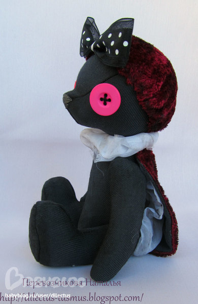 Агата ростом 21 см. Сшита из хлопка и плюша, в отделке шифон, набита холофайбером, 5 Т-образных шплинтов, глаза - пуговизы ( это обусловлено тем, что насекомые при внимательном рассмотрении напоминают мне каких-то космических существ, вот и захотелось придать моему созданию весьма необычный вид), нос вышит и залачен и тонирован золотом, сама Агата тонирована маслом.