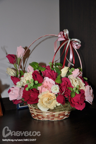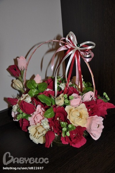 Хорошенькая корзиночка получилась! Только не пойму-у вас цветочи из креп-бумаги?