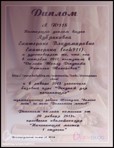 Екатерина в Рукоделие 13 лет Мои декупажные работы,выполненные в "Он-лайн Школе Декупажа Натальи Шихаревой Декупаж Урок №1 Урок №2 Урок №3 Урок №4 Урок №5 Урок №6 Урок №7 Урок №8 Урок №9 Урок №10 Урок №11 Урок №12 Урок №13 Экзамен Диплом Спасибо Школе за это удивительное время!!!! Посмотрите еще 20 записей на эту тему Отменить Ответить Оксана Дд, дайте пожалуйста ссылочку на эту он-лайн школу. Спасибо. 03.02.2013 Ответить Екатерина Вот ссылочка http://www.babyblog.ru/community/lenta/decoupageschool только туда больше учеников не набирают 04.02.2013 Ответить ксюша. все работы замечательны,каждую хочется расмотреть. 30.01.2013 Ответить Екатерина Спасибо большое!!! 31.01.2013 Ответить Markizulia очень классные работы 29.01.2013 Ответить Екатерина Спасибо большое,очень приятно! 29.01.2013 Ответить Альбина Поздравляю с окончанием! 29.01.2013 Ответить Екатерина Альбина, спасибо большое за ВСЁ!!!!! 29.01.2013 Ответить Альбина 29.01.2013 Ответить Юлия Поздравляю 29.01.2013 Ответить Екатерина Спасибо Юля!! 29.01.2013 Ответить Часики.... Тот самый день! Чаты Беременных Выберите чат: Январята-2026 Февралята-2026 Мартята-2026 Апрелята-2026 Майчата-2026 Июнята-2026 Июлята-2026 Августята-2026