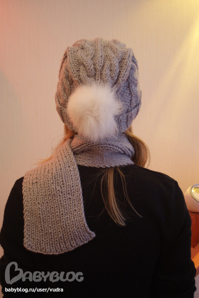 Я без схем работаю. Тут полностью воображение заказчици. Правили по ходу вязки. Шапка В начале двойная резинка. Потом чередую лицевые 2 петли изнанка 4 петли косы а 6 петель. Шарфик просто резинка 1 на 1.