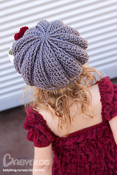 Мне кажется, что это обычный берет..только как то интересно закончен)..стообики с накилом..а полоски это рельефные столбики..набираешь 12 столбиков..из каждого один столбик и один рельефный..потом перед каждым рельефным делаешь прибавку и так до нужного диаметра..