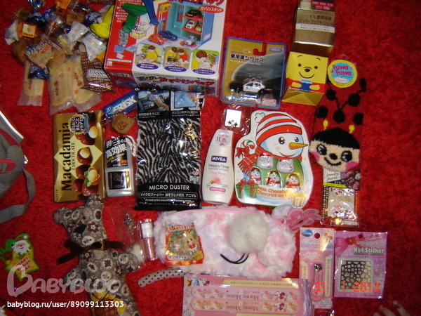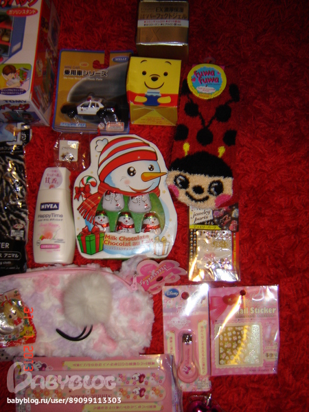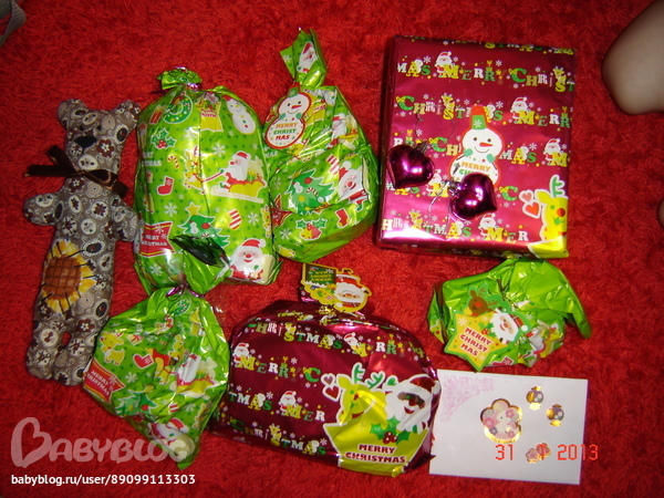 а в мешочках было ( парковка, машинка,шарики и мармелад для Ванечки), косметичка, лак и наклеечки со стразиками, пилочки, кусачки всё для ногтей, заколка, резинка с мехом, брелок, подвеска тоже с мехом и (я так поняла)молочко для тела- для дочки, для папы дезодорант, тряпочка для машины, жевательные конфетки, брелок. Для меня крем для лица, носочки и много много сладостей (половину я уже попробовала, не смогла удержаться, очень вкусненько)