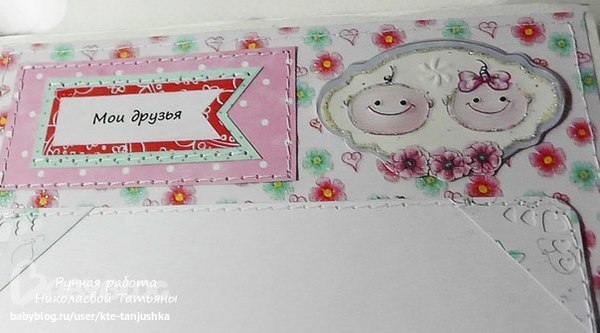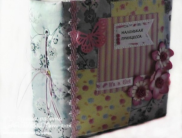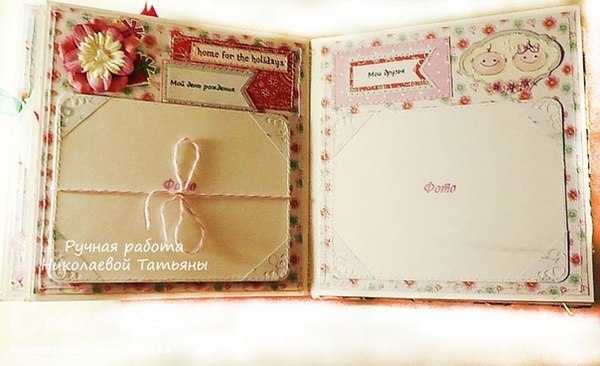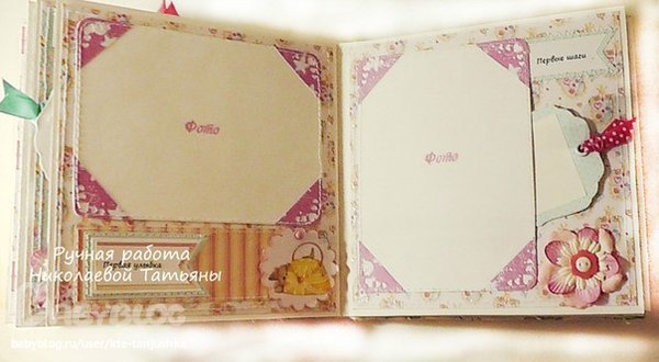 Альбомчик для девочки ( ищет хозяйку) формата 15*15 , обложка из ткани, проложена синтепоном , 7 разворотов, вмещает 23 фотографии 9*13, есть теги для записей. Смотрим: