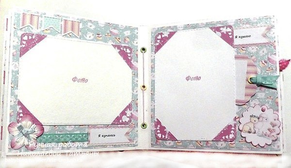 Четвертый разворот - я купаюсь (1 фото) и я кушаю ( 1 фото, под которым прячется тег для записи, записать например когда ввели прикорм, что малышка любит больше всего)