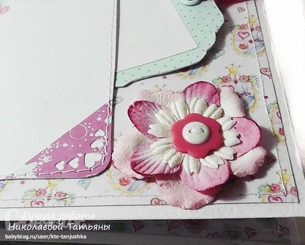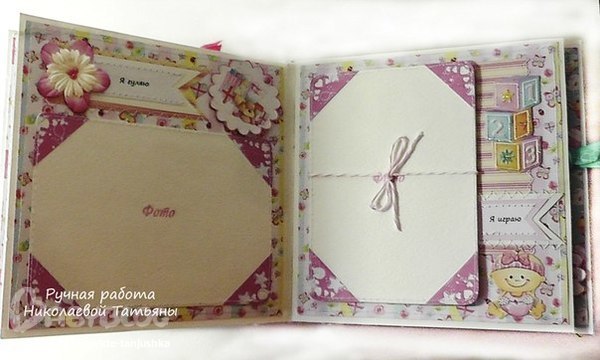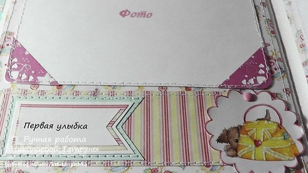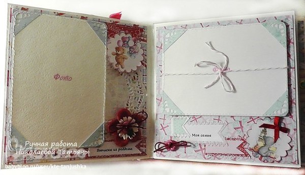 Первая страничка - про беременность, здесь тройная раскладушка вмещает 2 фото, кармашек для УЗИ, карман для тестика и страничка гуда мамочка может написать о том как протекала беременность;